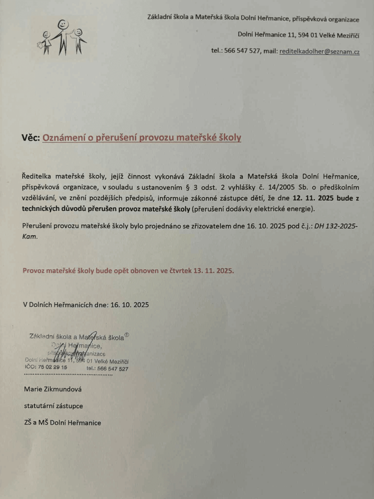 PŘERUŠENÍ PROVOZU MŠ - nepůjde elektřina