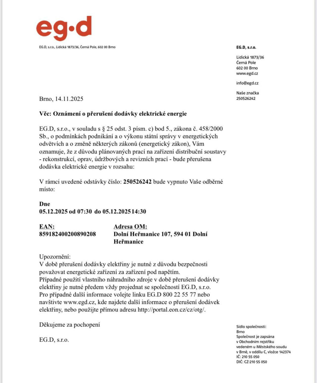 PŘERUŠENÍ PROVOZU MŠ - nepůjde elektřina