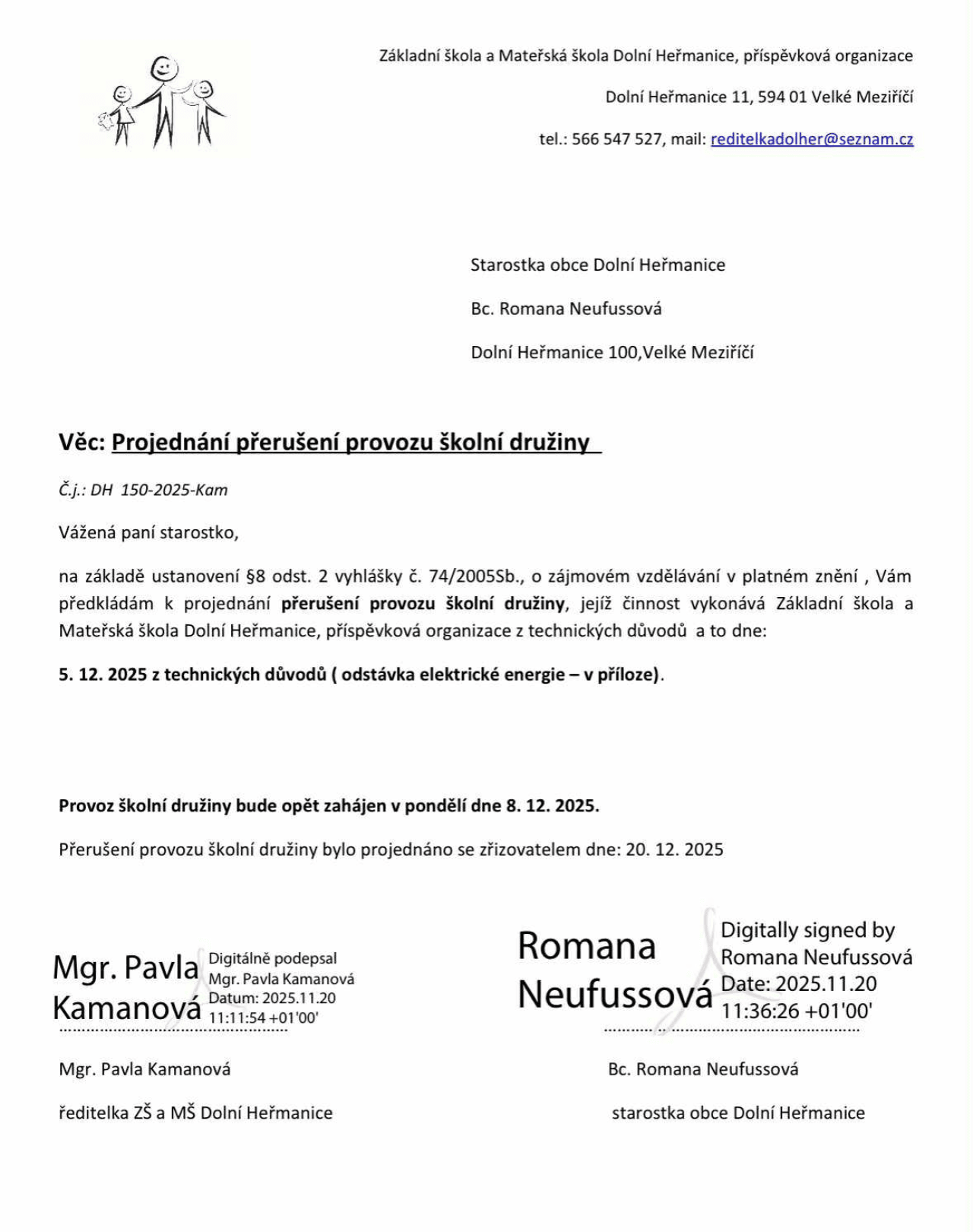 PŘERUŠENÍ PROVOZU ŠKOLNÍ DRUŽINY - nepůjde elektřina